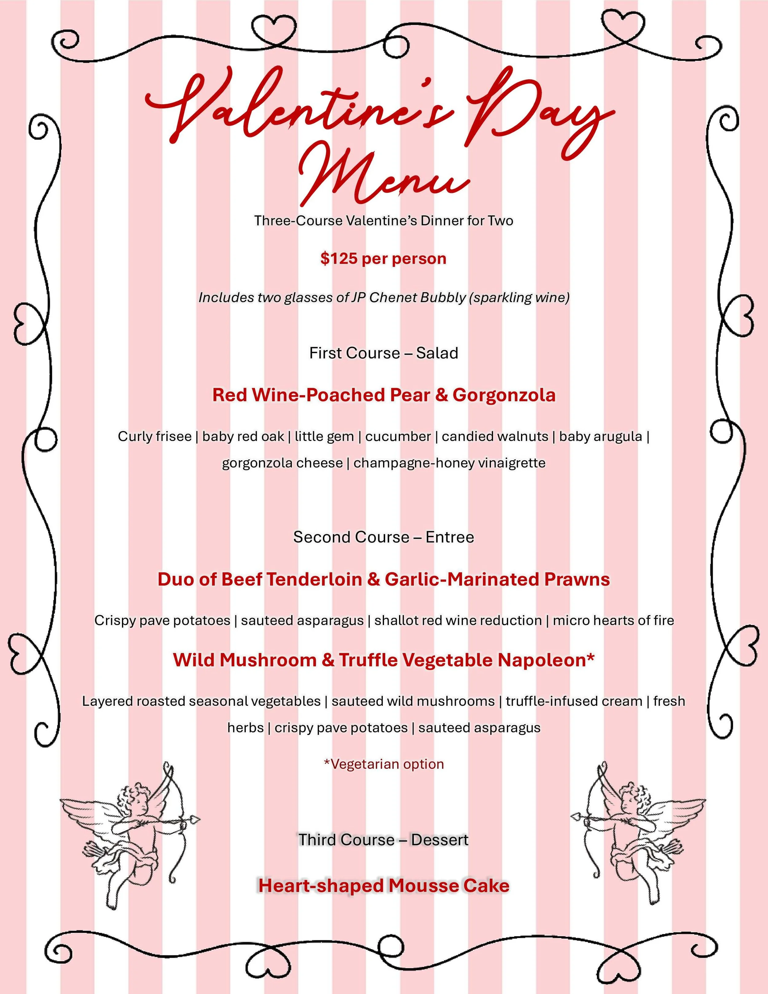 For Valentine’s Day, aside from our regular menu, we will be offering a prix fixe dinner option. We invite you and your valentine for a night of delicious food and wine.