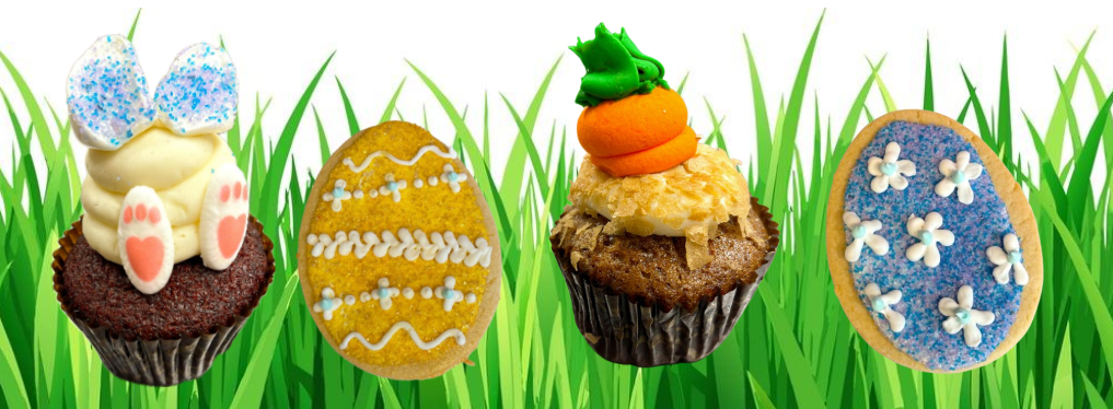 (red velvet bunny cupcake, easter egg sugar cookies, carrot cupcake)